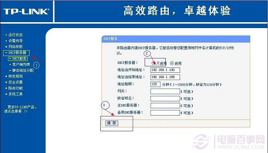 2、进入路由器管理界面之后,选择左侧菜单栏“DHCP服务器”→“DHCP服务”,选择不启用“DHCP服务器”,之后保存,如下图: