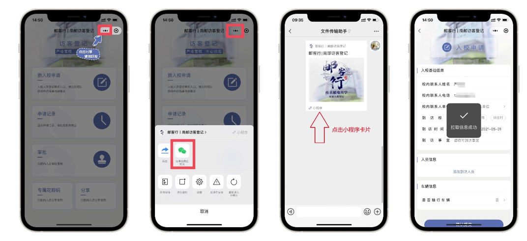 方式二:访客点击校内联系人分享的小程序卡片,可以自动获取联系人信息并进行填写;