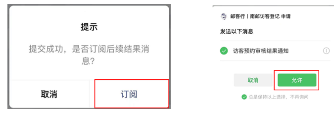 点击“确认提交”申请完成后,订阅审批结果,可以及时收到审批结果。审批结果也可在“申请记录”中查看。