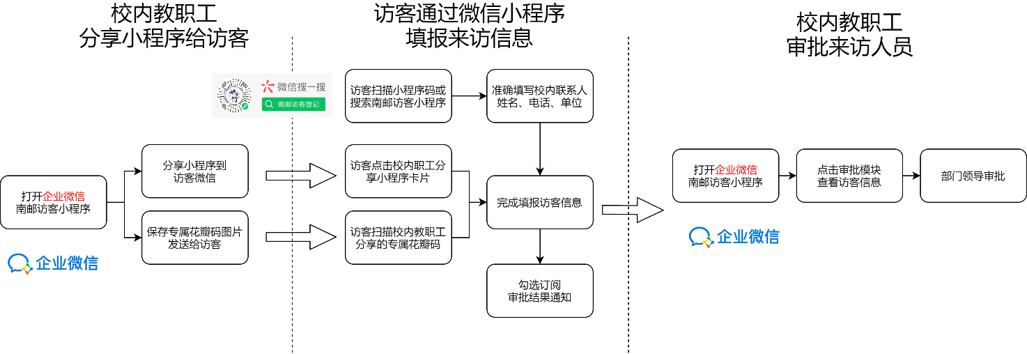 方式一:访客在微信中扫描小程序码或搜索“南邮访客登记”;