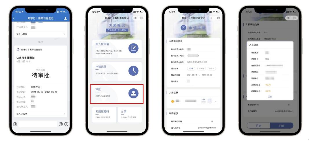 打开“企业微信”,进入“工作台”---“邮客行|南邮访客登记”小程序,通过“审批”栏目查看待审批访客详细信息;或可直接从消息页面“邮客行|南邮访客登记”对话窗口点击直接进入进行审批;